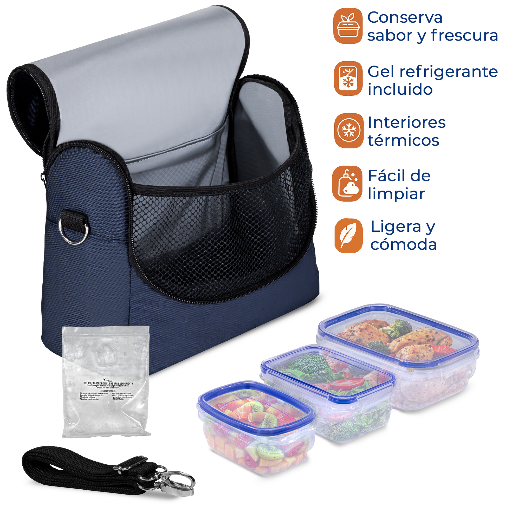 - Además INCLUYE GEL REFRIGERANTE REUTILIZABLE y 3 TUPPER HERMETICOS para mantener tus alimentos frescos en el trayecto al trabajo o la escuela.