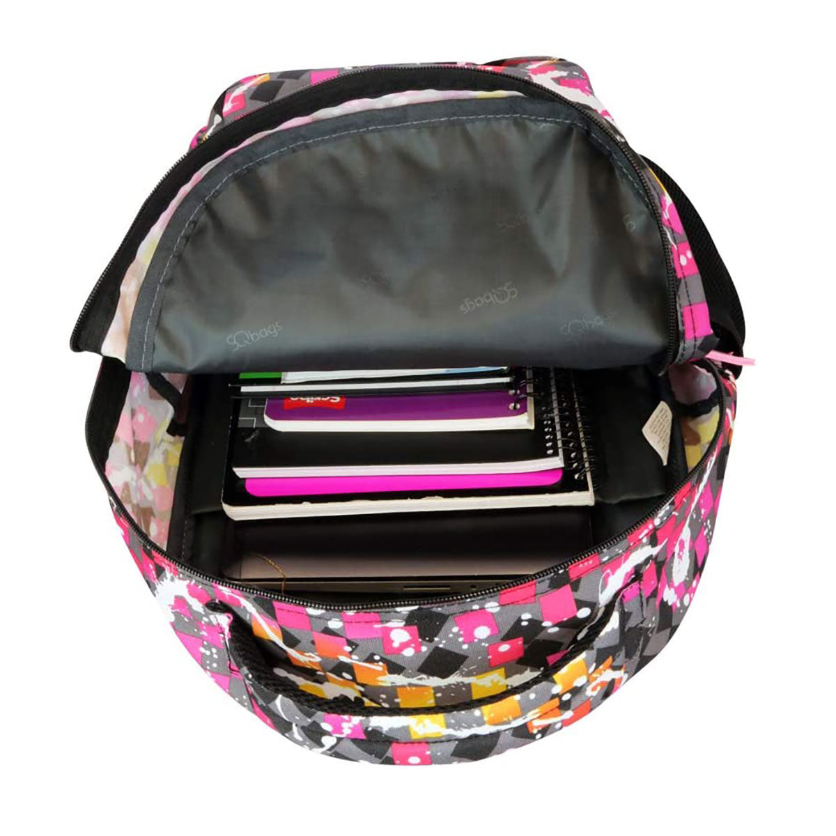 La mochila escolar rosa Confeti es perfecta para chicas que buscan un accesorio llamativo sin renunciar a la funcionalidad. Su diseño combina un fondo gris con cuadros rosas, morados y amarillos en un patrón alegre que recuerda a una lluvia de confeti, ¡ideal para destacar en la escuela, la universidad o el día a día!