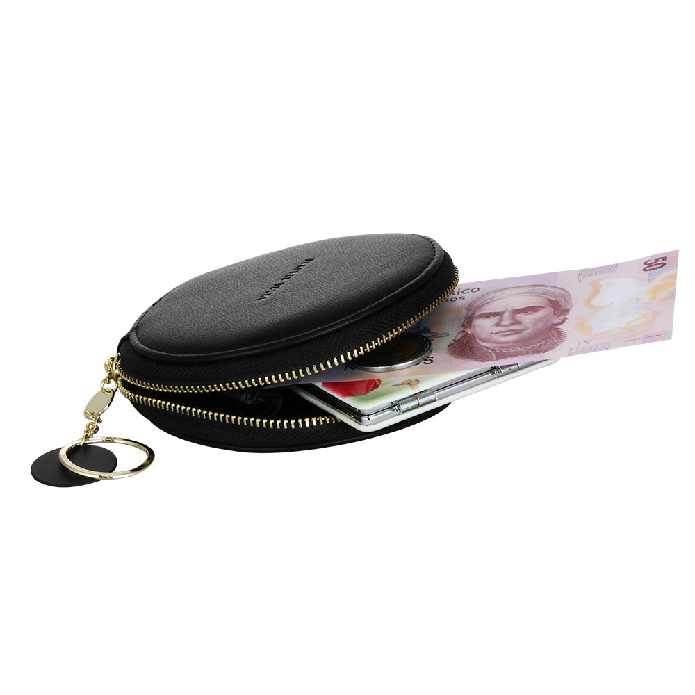 Nuestro monedero redondo es una obra de arte en sí mismo. Su diseño original en color mate le confiere un aire sofisticado y minimalista. Con una amplia abertura de 7 centímetros, tendrás fácil acceso a tus monedas y billetes. Además, su práctico accesorio colgante te permite llevarlo cómodamente a todas partes, ya sea enganchado a tu bolso o a tu cinturón. ¡Un toque de elegancia y funcionalidad para tu día a día!